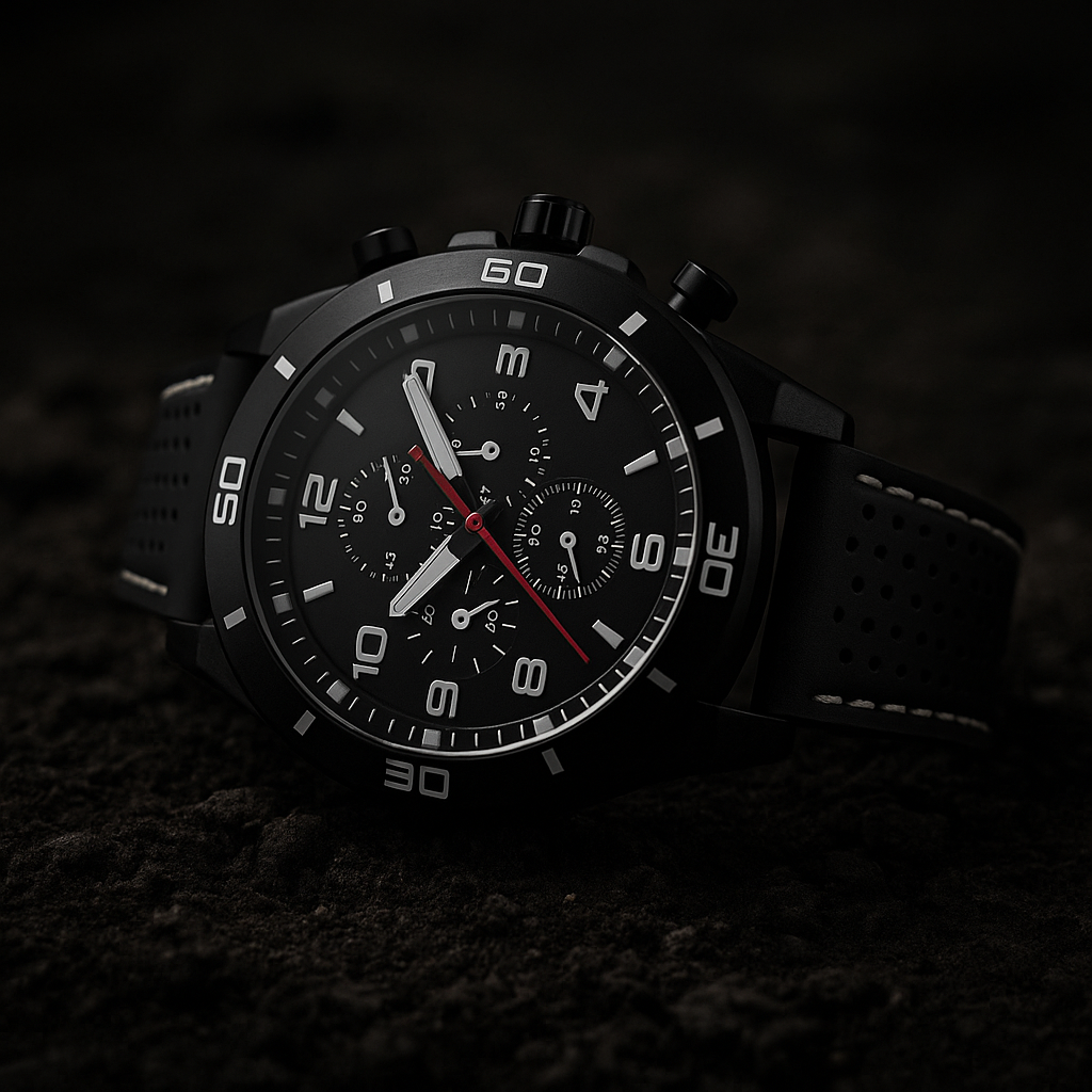 • Caja de aleación negra mate con bisel marcado y detalles en blanco de alto contraste.